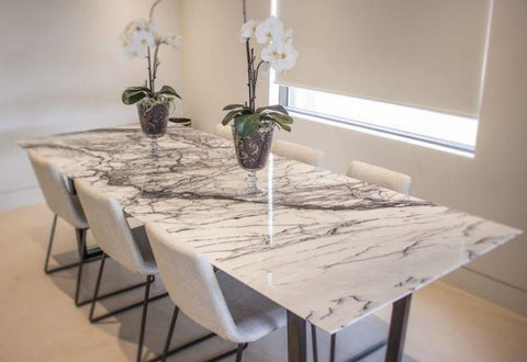 Mesa de comedor rectangular premium de mármol y hierro 100% mexicana y elaborada por Artesanos Poblanos.