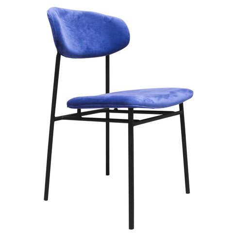 Silla con tela azul y patas de acero negro mate.